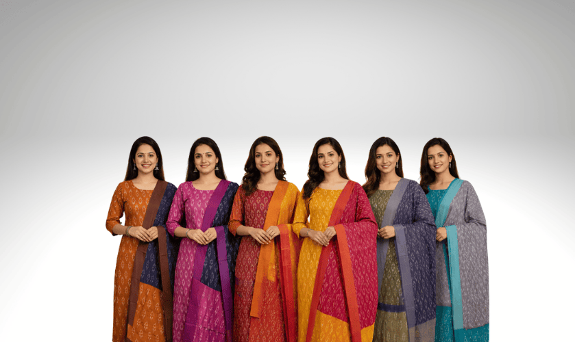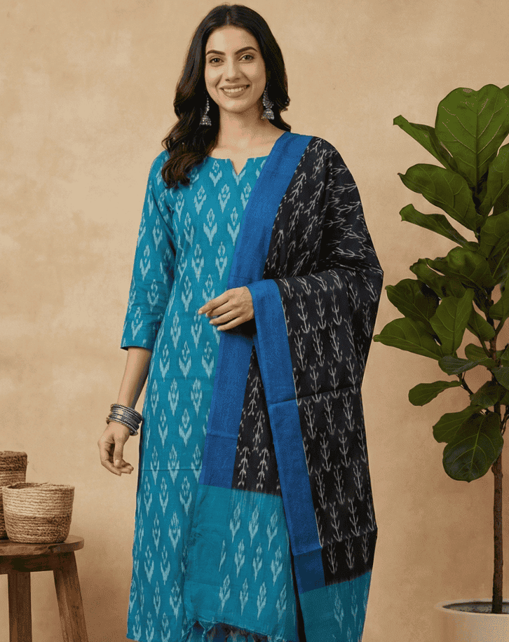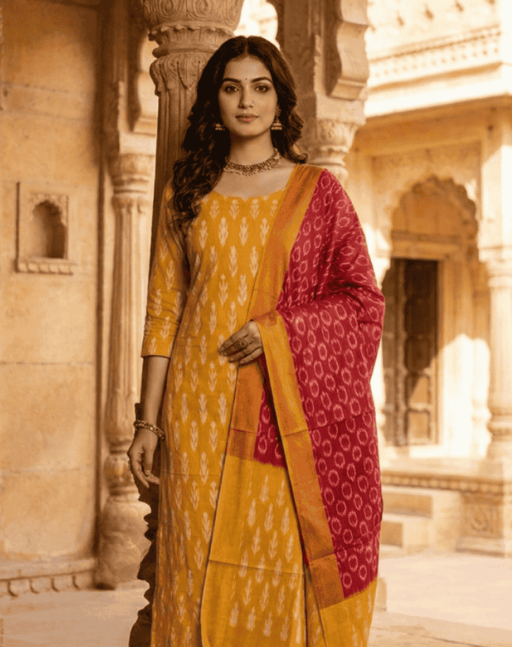 Looking for exquisite Ikkat fabrics, sarees, or suit sets in bulk? We sell a wide range of high-quality fabrics, including mercerised cotton, double Ikkat, 2/60s*2/60s, cotton, and more—perfect for all your textile needs. Our saree collection features beautiful wrap Ikkat, weft Ikkat, and double Ikkat sarees that showcase rich traditional designs combined with premium craftsmanship.