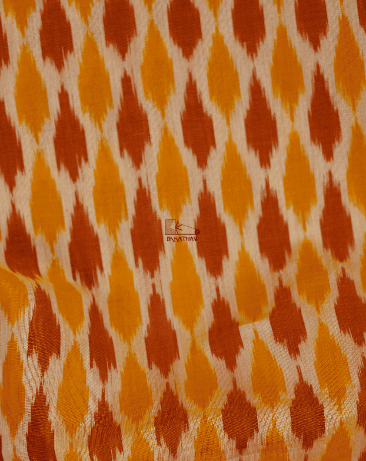 Mercerised Ikkat is made from mercerised cotton yarn. Mercerisation is a special treatment given to cotton yarn (using a controlled alkali process) before weaving, which improves the yarn’s quality.